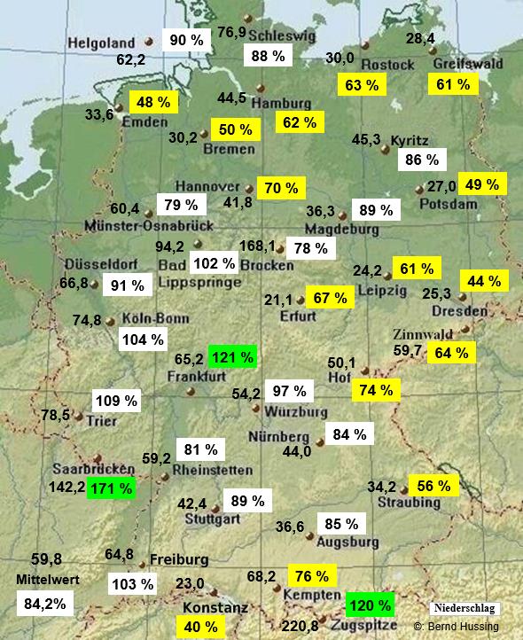 Niederschlagssumme, dahinter die Prozente im Vergleich zum langjährigen Mittel (1961-1990)