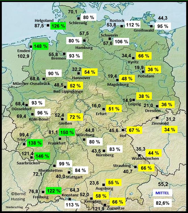 Niederschlagssumme, dahinter die Prozente im Vergleich zum langjährigen Mittel (1961-1990)