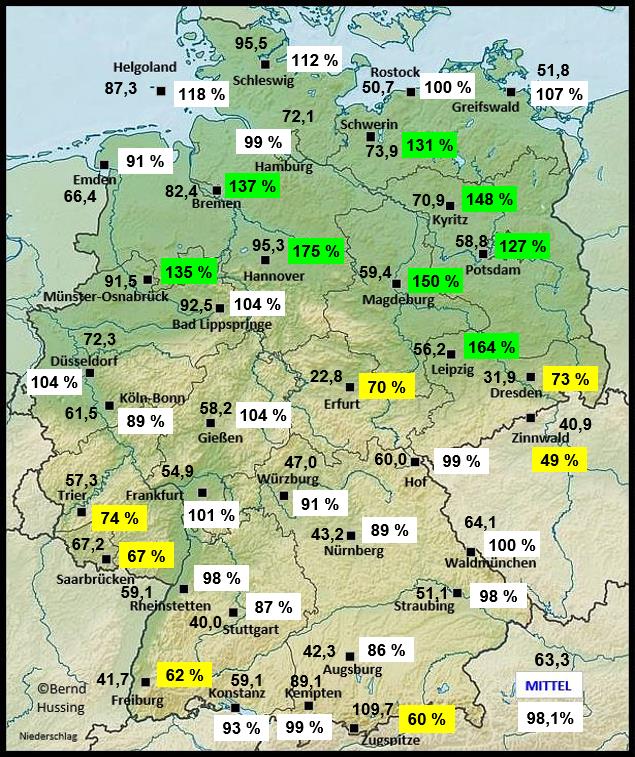 Niederschlagssumme, dahinter die Prozente im Vergleich zum langjährigen Mittel (1991-2020)