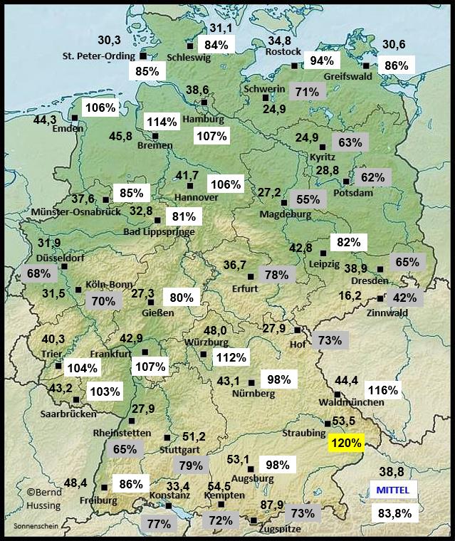 Sonnenscheinsumme, dahinter die Prozente im Vergleich zum langjährigen Mittel (1991-2020)