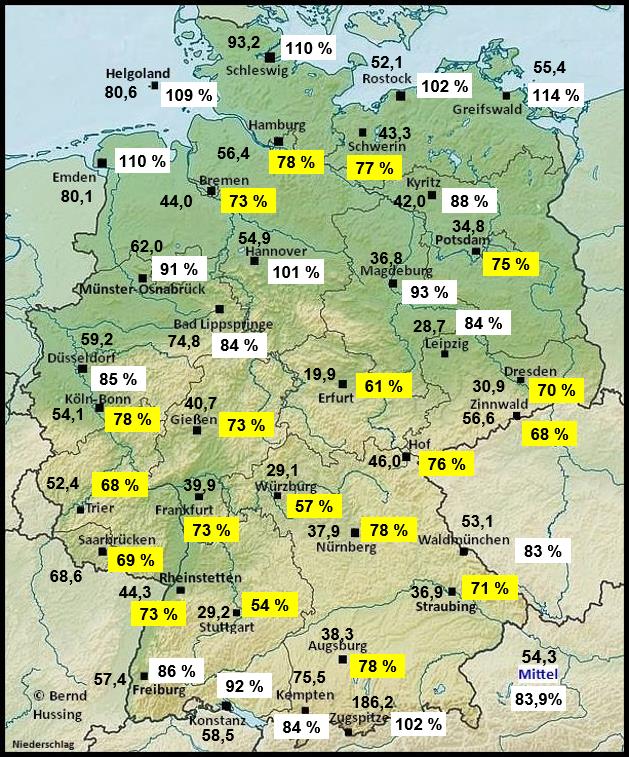 Niederschlagssumme, dahinter die Prozente im Vergleich zum langjährigen Mittel (1991-2020)