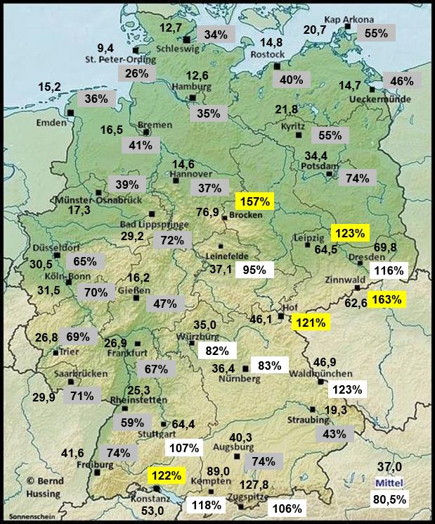 Sonnenscheinsumme, dahinter die Prozente im Vergleich zum langjährigen Mittel (1991-2020)