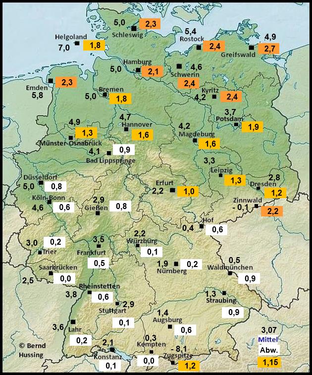Temperaturmittel, dahinter die Abweichung zum langjährigen Mittel (1991-2020)