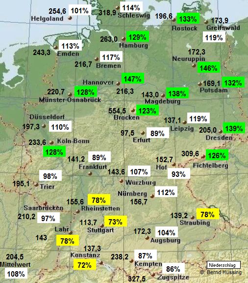Niederschlagssumme, dahinter die Prozente im Vergleich zum langjährigen Mittel (1961-1990)