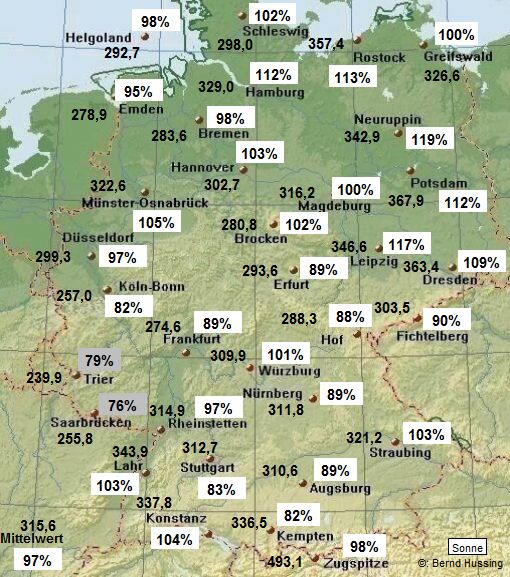 Sonnenscheinsumme, dahinter die Prozente im Vergleich zum langjährigen Mittel (1961-1990)