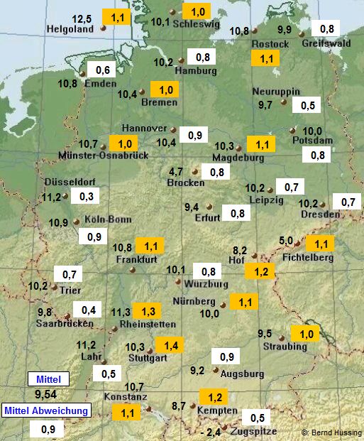 Temperaturmittel, dahinter die Abweichung zum langjährigen Mittel (1961-1990)