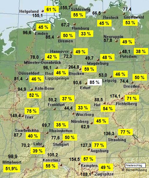 Niederschlagssumme, dahinter die Prozente im Vergleich zum langjährigen Mittel (1961-1990)