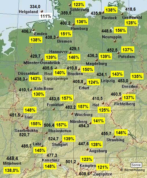 Sonnenscheinsumme, dahinter die Prozente im Vergleich zum langjährigen Mittel (1961-1990)
