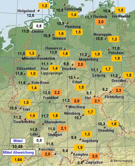 Temperaturmittel, dahinter die Abweichung zum langjährigen Mittel (1961-1990)
