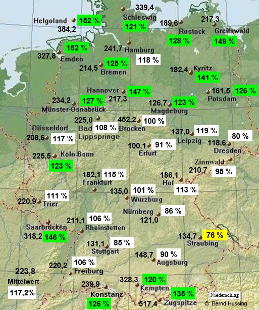 Niederschlagssumme, dahinter die Prozente im Vergleich zum langjährigen Mittel (1961-1990)