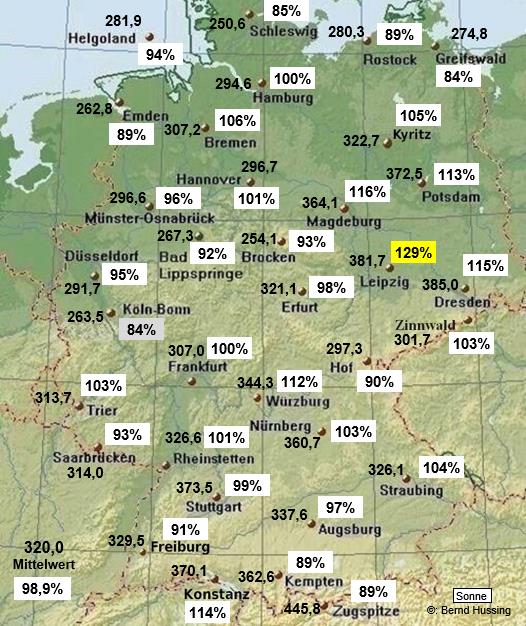 Sonnenscheinsumme, dahinter die Prozente im Vergleich zum langjährigen Mittel (1961-1990)
