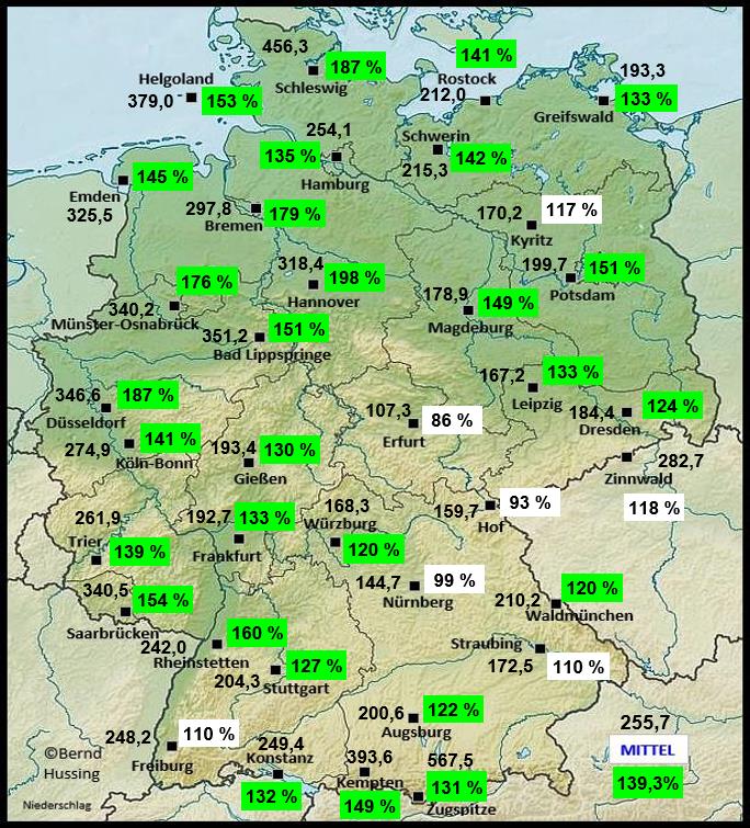Niederschlagssumme, dahinter die Prozente im Vergleich zum langjährigen Mittel (1991-2020)