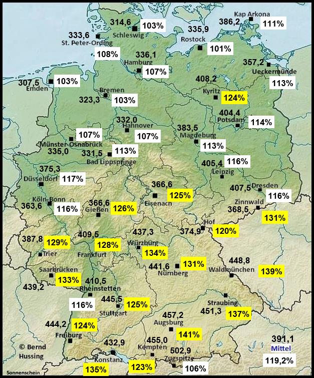 Sonnenscheinsumme, dahinter die Prozente im Vergleich zum langjährigen Mittel (1991-2020)