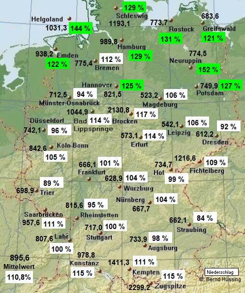 Niederschlagssumme, dazu die Prozente im Vergleich zum langjährigen Mittel (1961-1990)