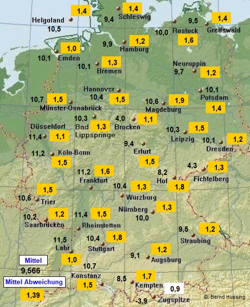 Temperaturmittel, dazu die Abweichung zum langjährigen Mittel (1961-1990)