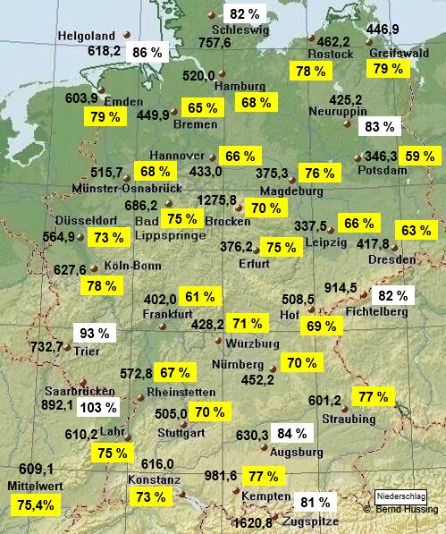 Niederschlagssumme, dazu die Prozente im Vergleich zum langjährigen Mittel (1961-1990)
