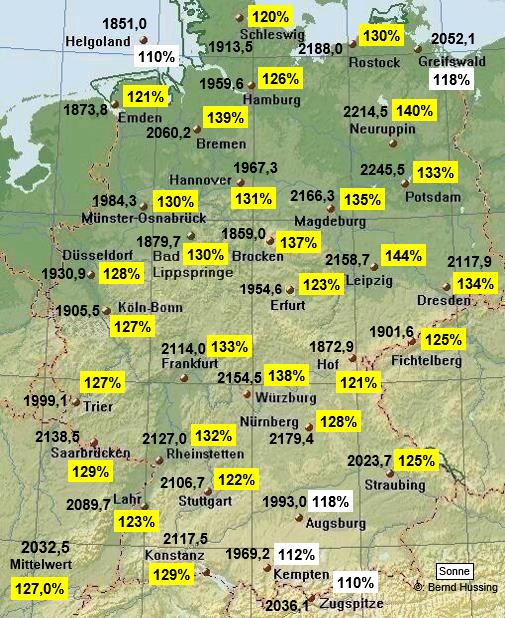 Sonnenscheinsumme, dazu die Prozente im Vergleich zum langjährigen Mittel (1961-1990)