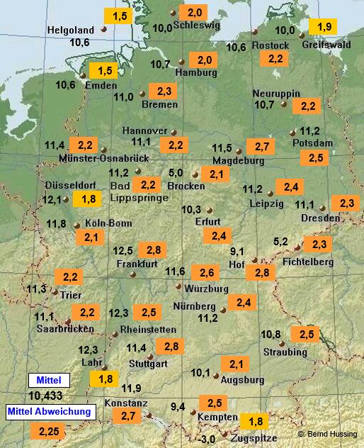 Temperaturmittel, dazu die Abweichung zum langjährigen Mittel (1961-1990)