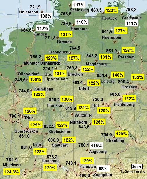 Sonnenscheinsumme, dahinter die Prozente im Vergleich zum langjährigen Mittel (1961-1990)
