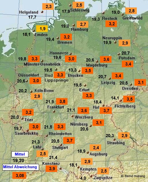 Temperaturmittel, dahinter die Abweichung zum langjährigen Mittel (1961-1990)