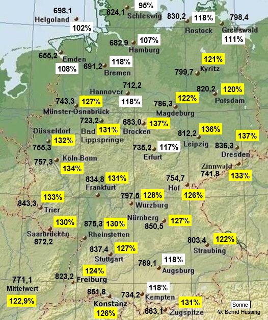 Sonnenscheinsumme, dahinter die Prozente im Vergleich zum langjährigen Mittel (1961-1990)