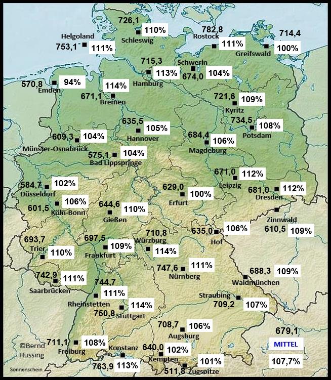Sonnenscheinsumme, dahinter die Prozente im Vergleich zum langjährigen Mittel (1961-1990)