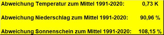 Folgende Grafiken sind alle vom Deutschen Wetterdienst (DWD) von der Seite (ACHTUNG: bei den Abweichungen ist der Bezugszeitraum 1961-1990):