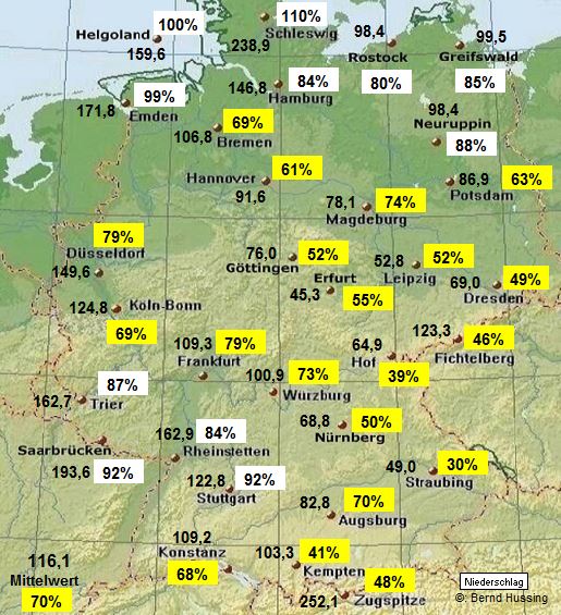 Niederschlagssumme, dahinter die Prozente im Vergleich zum langjährigen Mittel (1961-1990)