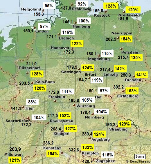 Sonnenscheinsumme, dahinter die Prozente im Vergleich zum langjährigen Mittel (1961-1990)