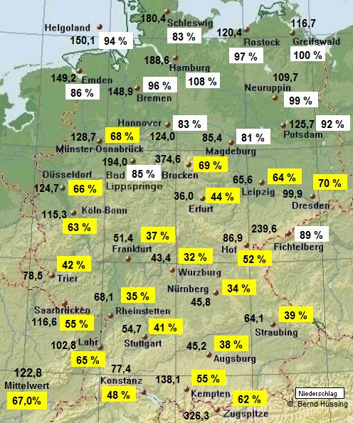 Niederschlagssumme, dahinter die Prozente im Vergleich zum langjährigen Mittel (1961-1990)