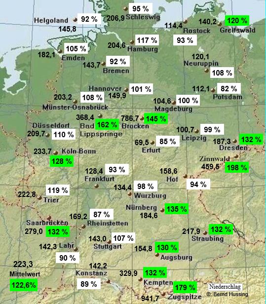 Niederschlagssumme, dahinter die Prozente im Vergleich zum langjährigen Mittel (1961-1990)