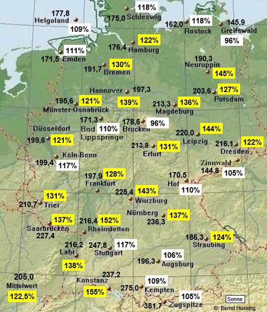 Sonnenscheinsumme, dahinter die Prozente im Vergleich zum langjährigen Mittel (1961-1990)