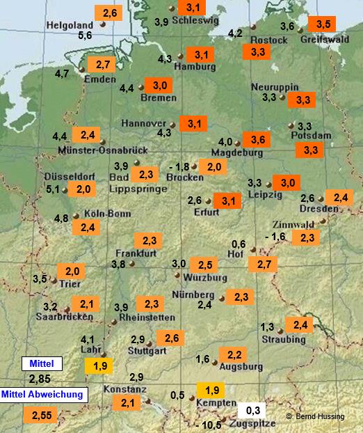 Temperaturmittel, dahinter die Abweichung zum langjährigen Mittel (1961-1990)