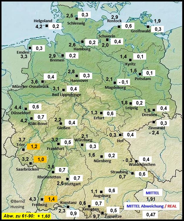Temperaturmittel, dahinter die Abweichung zum langjährigen Mittel (1991-2020)
