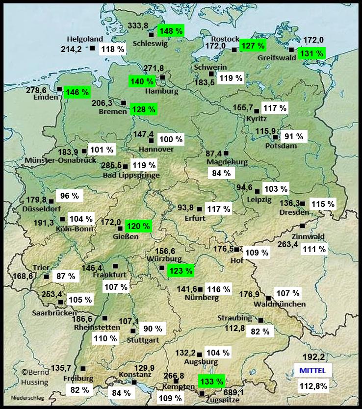 Niederschlagssumme, dahinter die Prozente im Vergleich zum langjährigen Mittel (1991-2020)