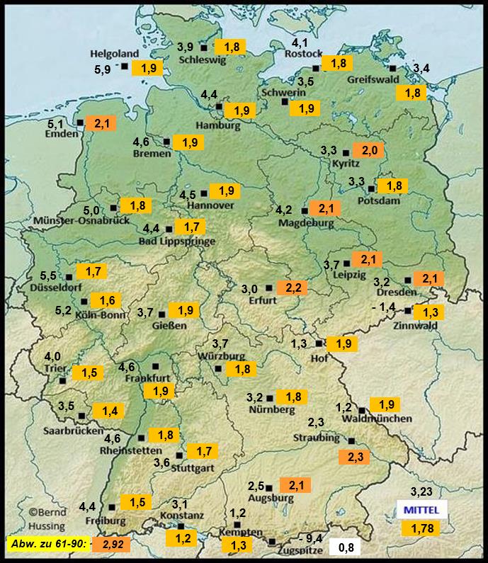 Temperaturmittel, dahinter die Abweichung zum langjährigen Mittel (1991-2020)