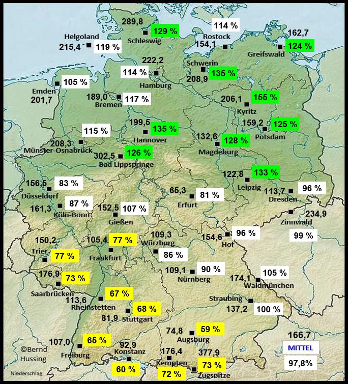 Niederschlagssumme, dahinter die Prozente im Vergleich zum langjährigen Mittel (1991-2020)