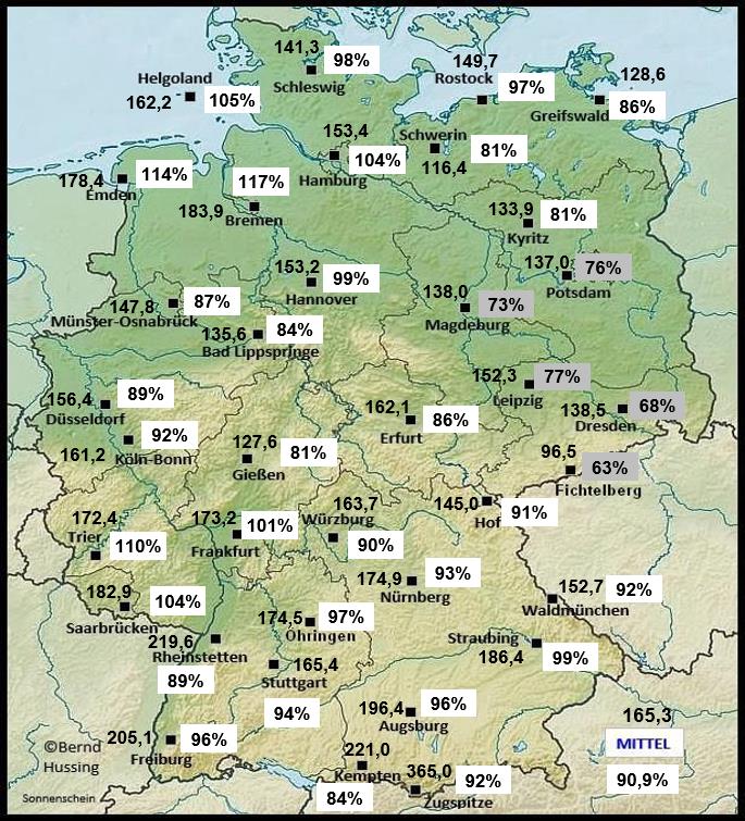Sonnenscheinsumme, dahinter die Prozente im Vergleich zum langjährigen Mittel (1991-2020)